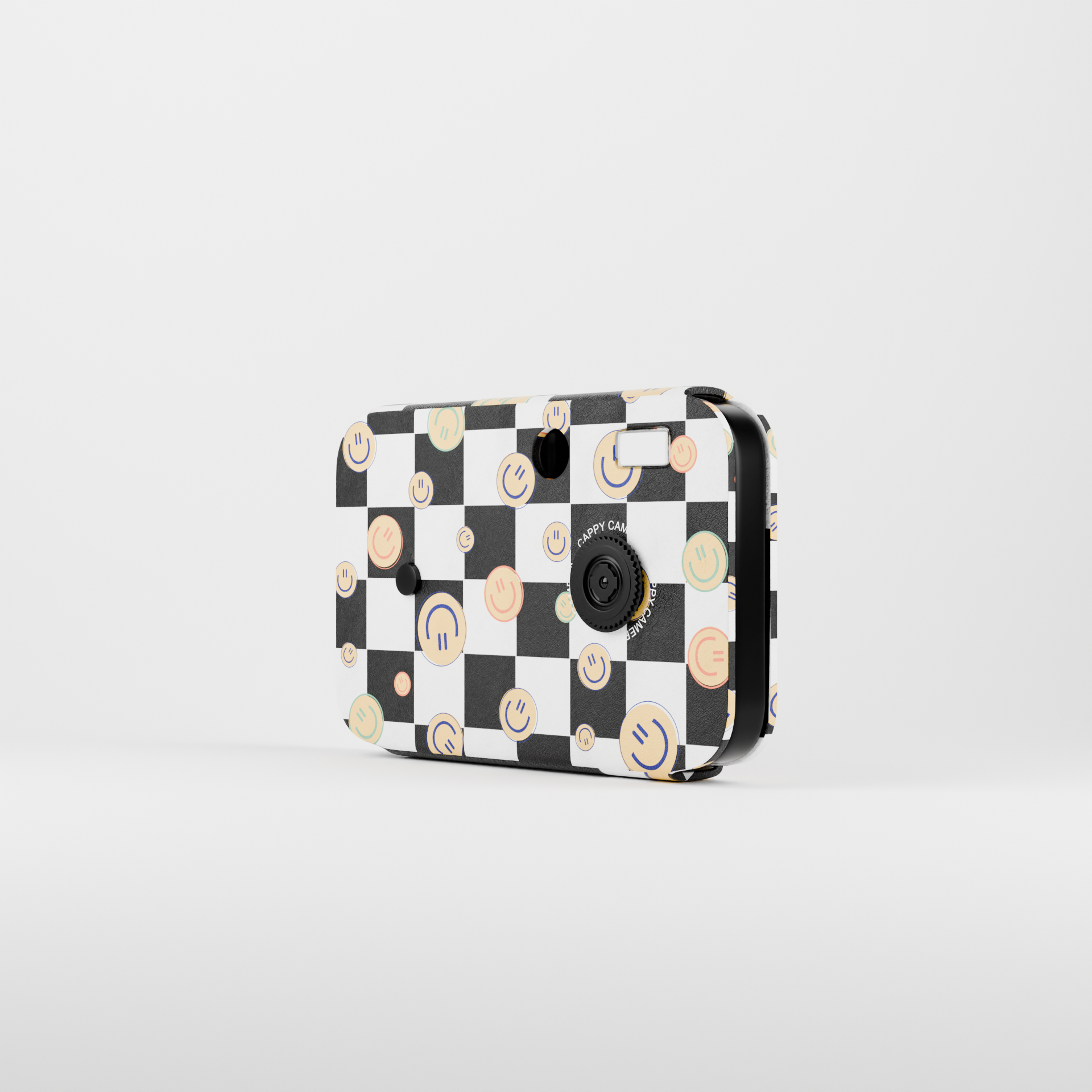 Smiley Checkers: Black-and-white checkerboard canvas dotted with cheeky pastel smiley faces, blending 90s whimsy with retro edge. Eco-lightweight shield for your Cappy Camera, perfect for joyful creators turning everyday shots into feel-good nostalgia.
